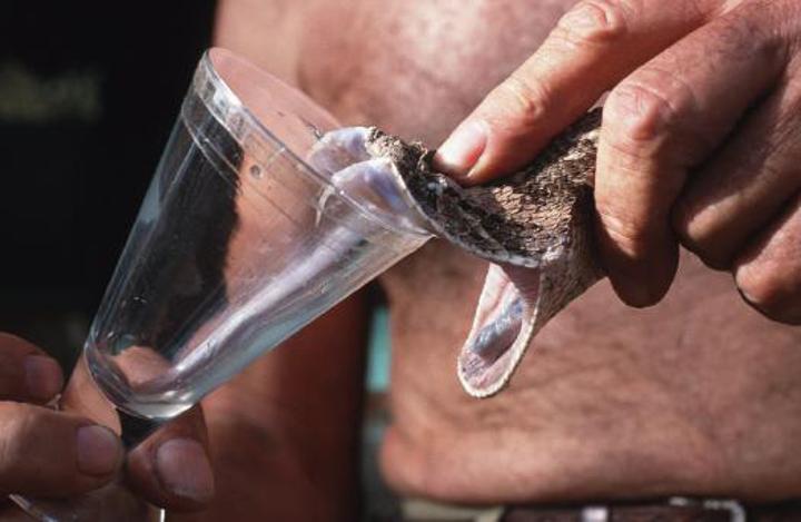 Various experimental methods were tested, and by the 1920s, the best method was the production of antivenom using the blood plasma of domestic animals, usually horses. This method is still used over a century later. First, venom is extracted from snakes using a process called “milking,” where a trained person holds a snake behind his head and presses the mouth against a piece of plastic wrapped to a glass container. Then, when the snake opens its mouth and extends its fangs through the plastic wrap, the person presses the top of the head where the venom glands are located. This forces the venom out of the paired venom glands, and the poison is ejected through the hollow fangs into the glass container.