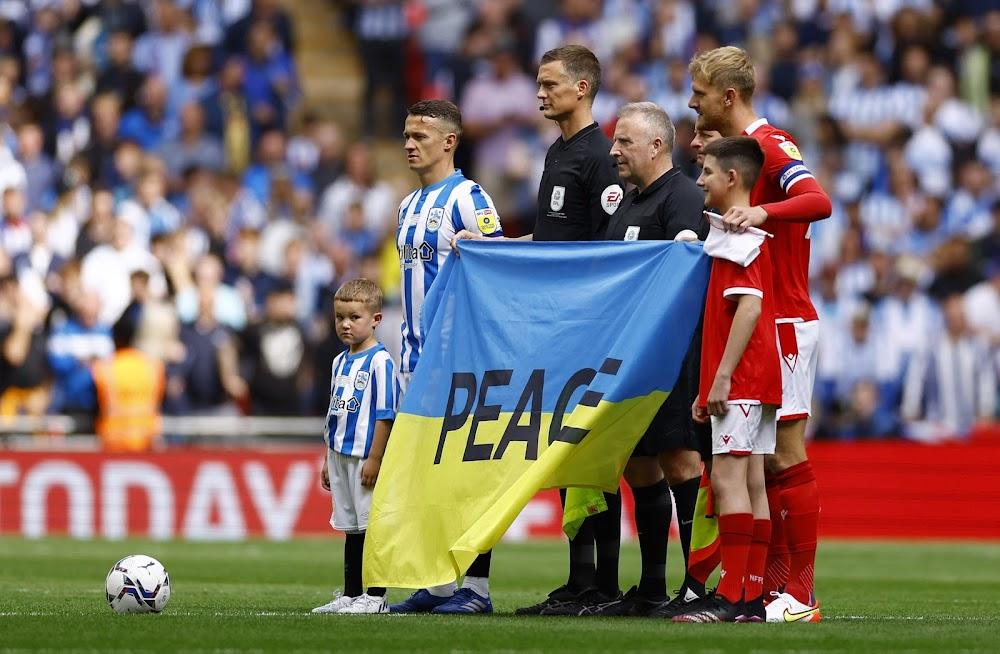 The players stood for the national anthem and a video address from president Volodymyr Zelensky before the match