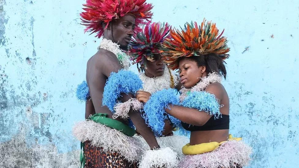 Dancers prepare to perform at a cultural event held in Cameroon’s main city Douala on Saturday to promote national unity.
