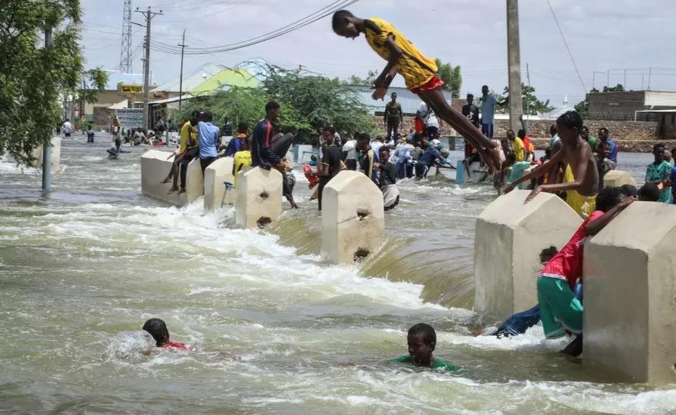 Climate change seems to be a long way from the mind of this young boy as he dives into floodwater in Somalia’s Beledweyne city on Sunday…