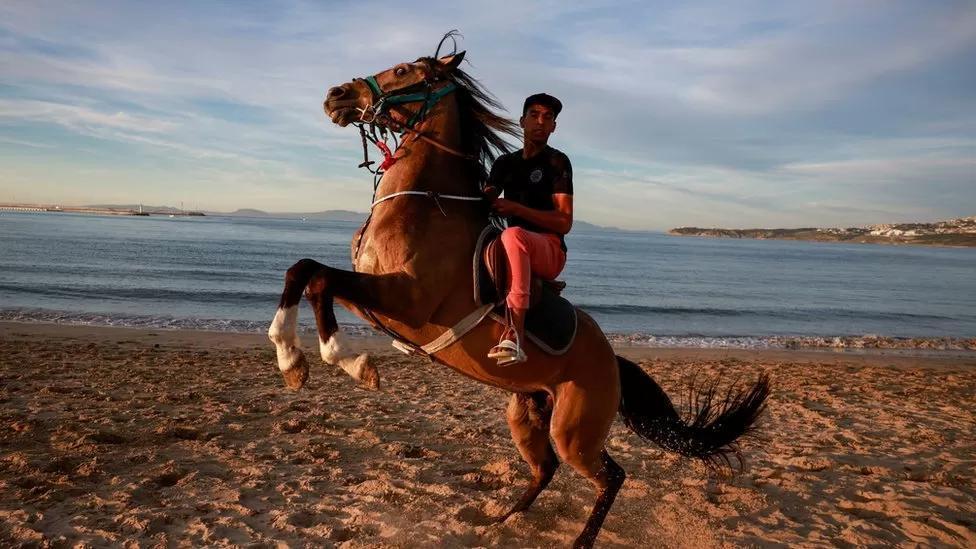 A rider and his horse enjoy the beach in Tangier, Morocco, on Sunday.