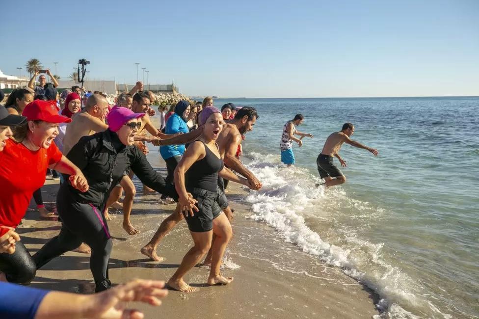 Swimmers in Tunisia’s coastal town of Nabeul take a New Year’s Day dip in the Mediterranean.