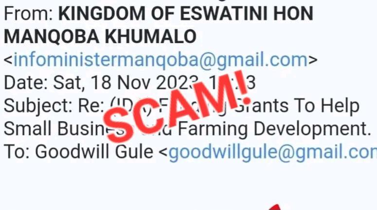 The Government of Eswatini warned the public of an online scam whereby members of the public receive an email which falsely claims to be from the Minister of Commerce.