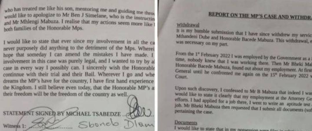 “Upon such discovery, I confessed to Mr B Mabuza that indeed I was employed by the Government. I would like to state it clearly that my employment at the Attorney General’s Chambers was purely my efforts.I had applied for a job there, I went to write an aptitude test and I was informed that I got the job.Mr Bheki Mabuza then requested that I would submit all documents(soft and hard copies) in my disposal pertaining the case”, reads the confession letter in part, signed by the alleged spying lawyer.