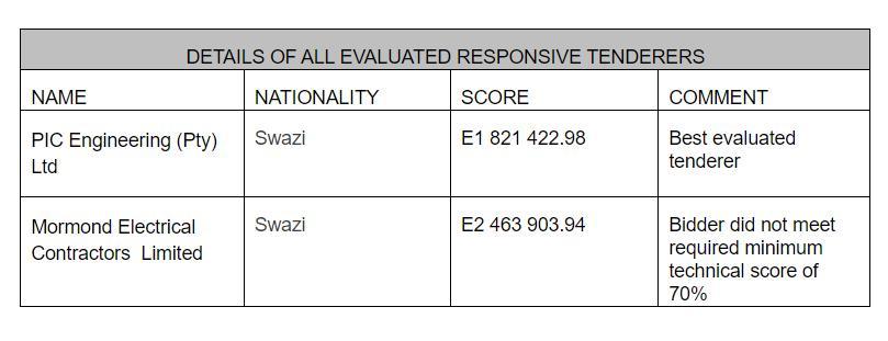 Only tow companies showed interest for the tender which was for the Design, Supply, and Installation of power factor correction. The best evaluated company enlisted was PIC Engineering (Pty) Ltd, their evaluated price totalled was E1 821 422.98. This was revealed by the Eswatini Public Procurement Regulatory Agency (ESPPRA) on their website.