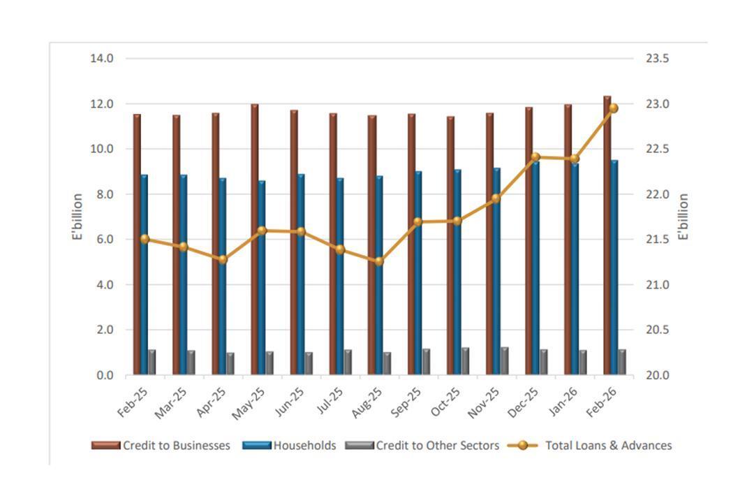Credit extended to the private sector increased to E22.9 billion in February 2026, reflecting a 2.5% rise month-on-month and 6.7% growth year-on-year. The expansion was supported by improved lending to businesses, households, and other domestic sectors.