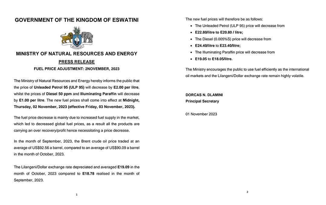 According to a press release, the price of Unleaded Petrol 95 (ULP 95) will decrease by E2.00 per litre, while Diesel 50 ppm and Illuminating Paraffin will see a reduction of E1.00 per litre. This decrease is attributed to an increase in fuel supply, leading to a decline in global fuel prices. The drop in the Brent crude oil price from an average of US$92.56 a barrel in September to US$90.09 a barrel in October, coupled with a depreciation in the Lilangeni/Dollar exchange rate from E18.78 to E19.09, contributed to this downward trend in fuel prices.