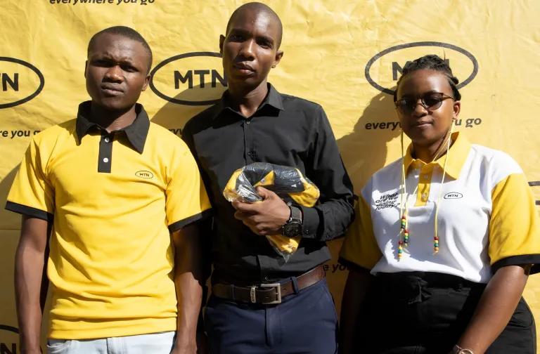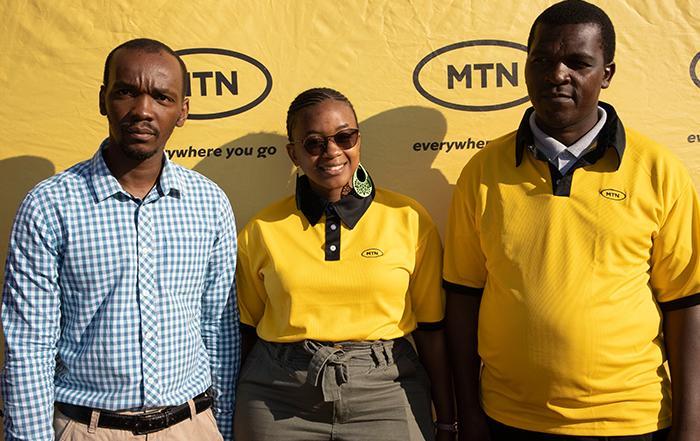 Manzini Nazarene High School Teacher Linda Mlotsa flanked by MTN’s Sizwe Simelane and Temakholo Matsebula.