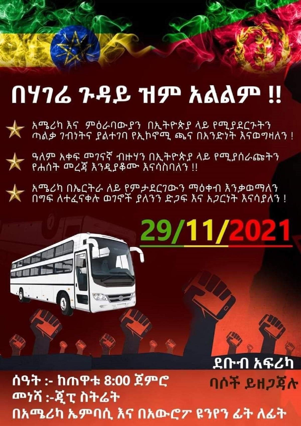 Chairperson of the United Ethiopian Community Association in South Africa, Prof. Mulatu Fekadu told ENA that the demonstration will take place on the coming Monday in front of the US Embassy and European Union Mission offices in Pretoria.