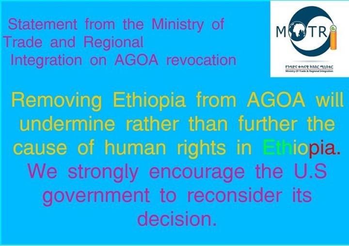 Africa-Press – Ethiopia. mber 27/2021/ENA/ The Government of Ethiopia deeply regrets the decision of the US government to terminate the continued eligibility for trade benefits under the African Growth and Opportunity Act (AGOA), according to Ministry of Trade and Regional Integration.