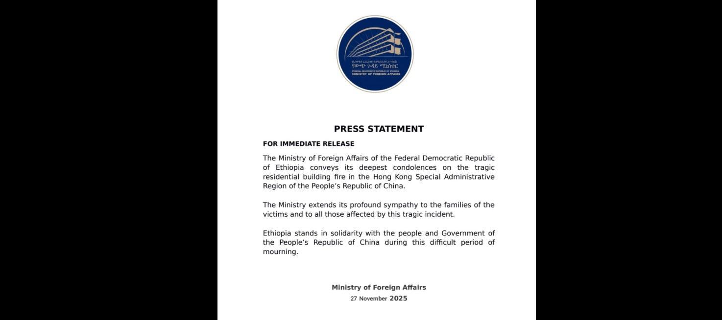 The statement reads: “The Ministry of Foreign Affairs of the Federal Democratic Republic of Ethiopia conveys its deepest condolences on the tragic residential building fire in the Hong Kong Special Administrative Region of the People’s Republic of China.”