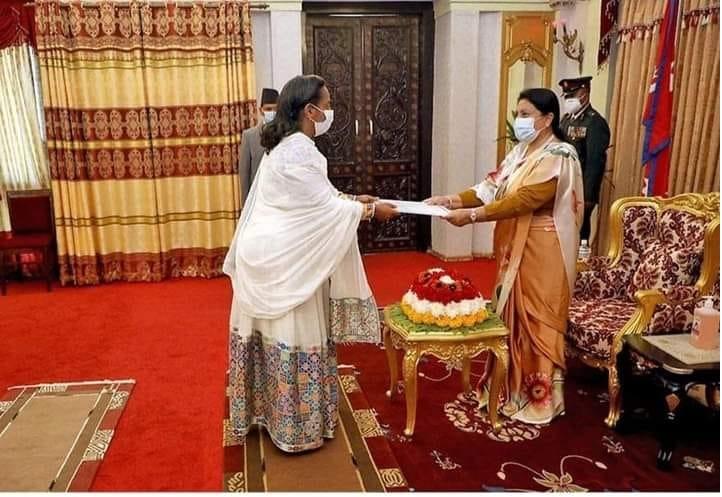 Ethiopian Ambassador to Nepal, Tizita Mulugeta has presented her Letter of Credence to President Bidhya Devi Bhandari at Shital Niwas, Kathmandu, according to Spokesperson Office of the Ministry of Foreign Affairs.