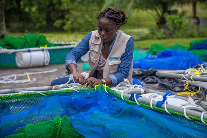 Par ailleurs, après avoir mené des recherches sur les besoins des pisciculteurs, la FAO a organisé des cours de formation dans trois provinces – Estuaire, Oyem et Bitam – afin de renforcer les capacités techniques, les compétences de production et le savoir-faire commercial de jeunes entrepreneurs et entrepreneuses, dont Céleste. Au nombre des sujets abordés figuraient la sélection des sites de pisciculture, la fabrication et l’assemblage de cages flottantes, les techniques de production et l’amélioration de la qualité des stocks de géniteurs pour le tilapia et le poisson-chat.