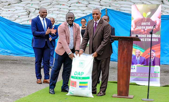 Le ministre de l’Agriculture et de l’Alimentation, Charles Mve Ellah, a procédé le 28 mars 2023 à la remise officielle des 2000 tonnes de fertilisants offertes par le Roi Mohammed VI du Maroc, aux responsables provinciaux agricoles du Gabon. «Ce don royal constitué de 40 000 sacs de 50Kg arrive donc à point nommé pour booster la production nationale, en même temps il s’inscrit dans l’atteinte des objectifs fixés par l’Union africaine. Nous pouvons affirmer que ce don est un pas en avant vers la mise en œuvre des accords d’Abuja de 2006 sur les engrais azotés en faveur de la révolution verte africaine», a déclaré Charles Mve Ellah.