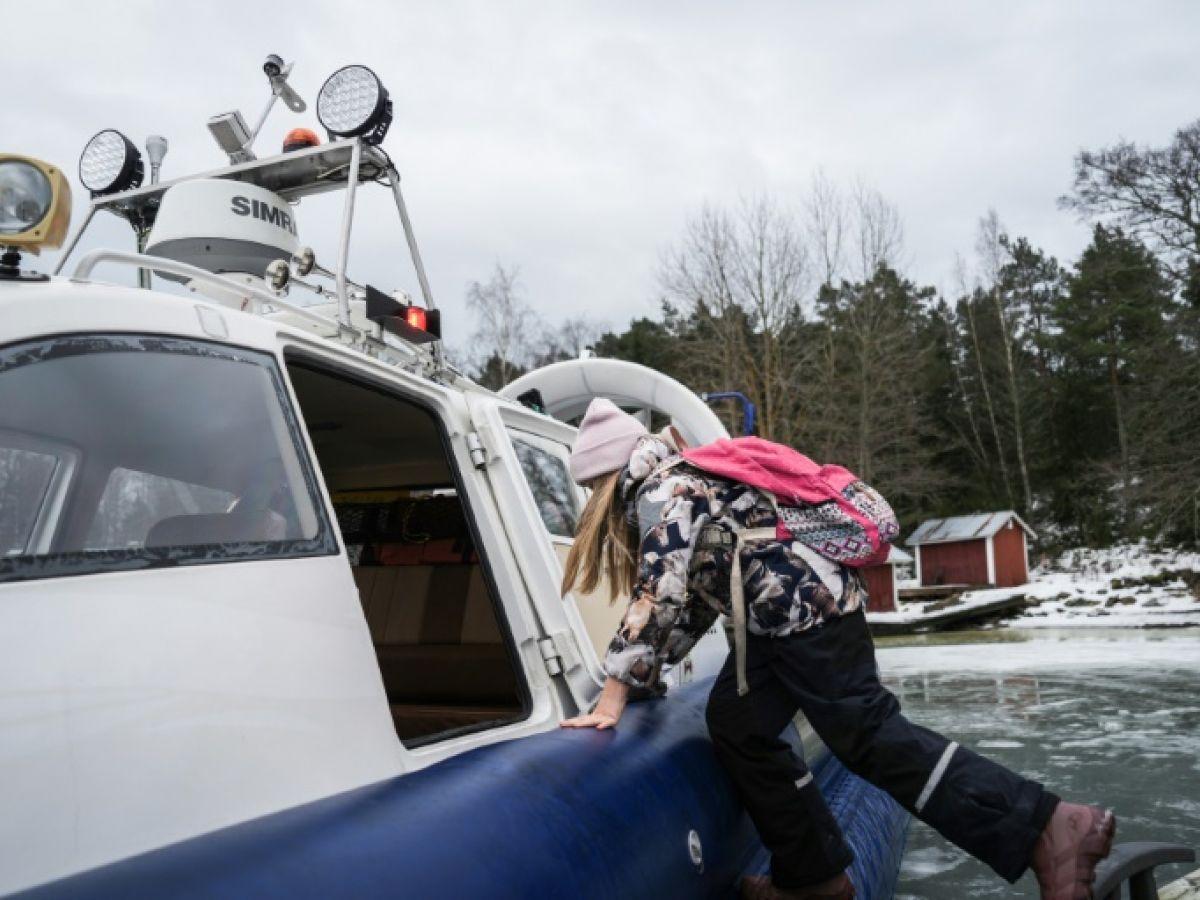 Une fois les coussins situés sous l’embarcation remplis d’air, l’embarcation s’élève au-dessus de la surface de la glace et traverse la mer gelée. Ce trajet scolaire est « excitant, surtout quand il dérive comme ça », dit Hugo Wickström, montrant comment l’aéroglisseur glisse latéralement sur la glace.