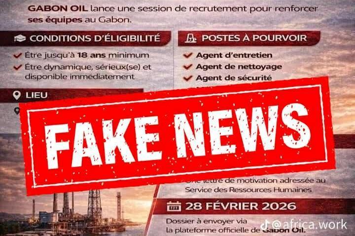 Selon un faux document qui circule sur les réseaux sociaux, Gabon Oil Compagny aurait lancé un avis officiel de recrutement pour renforcer ses équipes. L’entreprise chercherait les agents d’entretien, de nettoyage et de sécurité. Les postulants à l’emploi sont appelés dans le document, à envoyer leurs dossiers via les plateformes électroniques de la société.