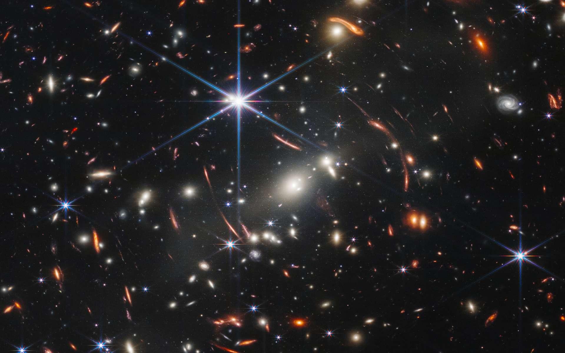 La lumière, après avoir parcouru un tel chemin, s’est étirée, passant du spectre visible à l’infrarouge – une longueur d’onde invisible pour des yeux humains, mais pas pour ceux de James Webb. Ce dernier a visé, pour ce cliché illustrant les temps lointains du cosmos, l’amas de galaxies SMACS 0723 qui, agissant comme une loupe, a également permis de faire apparaître des objets cosmiques très lointains situés derrière lui – un effet appelé lentille gravitationnelle.