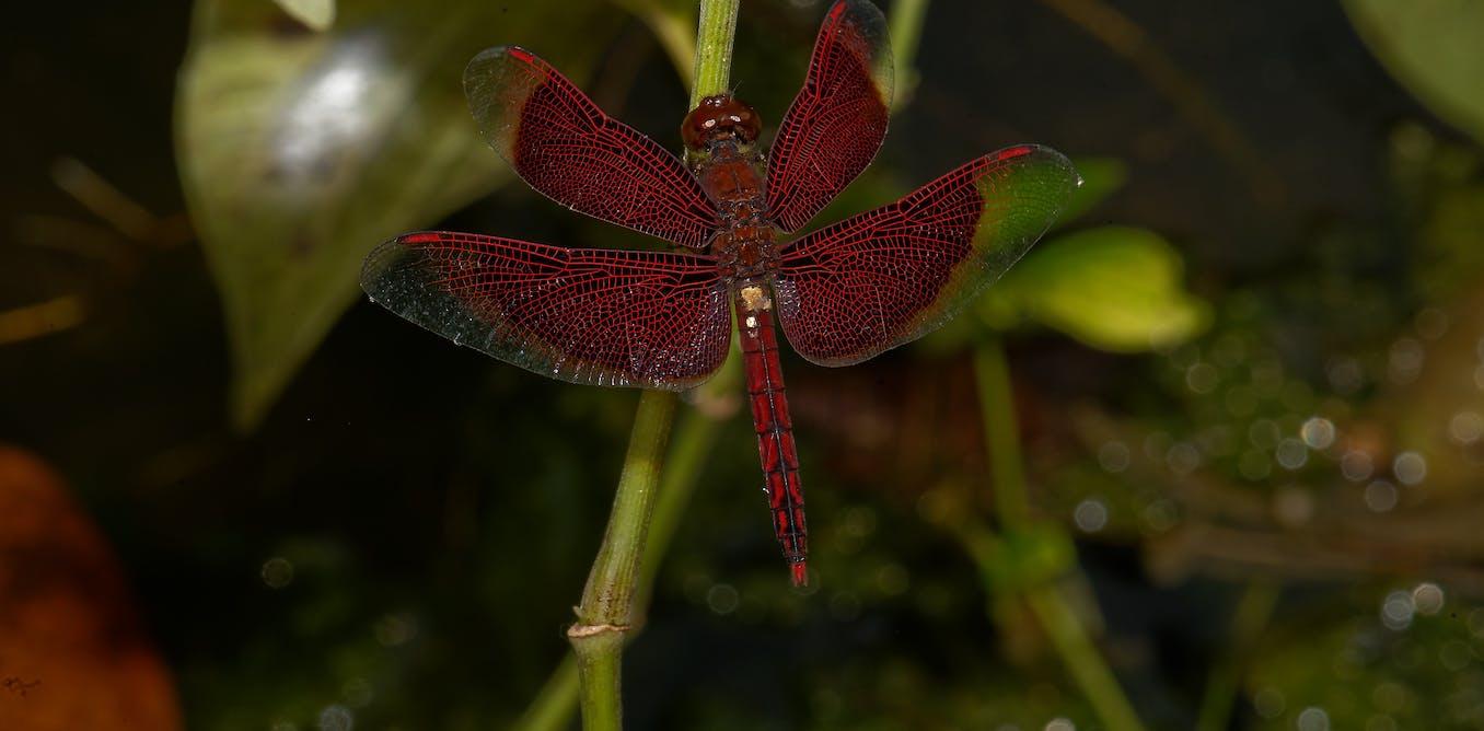 Dans une mare forestière ensoleillée, le mâle de Neurothemis arbore ici une couleur lie de vin spectaculaire sur les ailes, dont les nervures sont soulignées d’un rouge carmin. Ses ailes sont incurvées vers le bas, ce qui n’est pas fréquent chez les libellules, et on croit voir une fleur aux pétales rouges dont les pétales pendent. Comme ils se perchent au sommet de plantes comme des joncs ou des graminées aquatiques, un prédateur (un oiseau par exemple) ou un observateur peut voir une fleur dans son environnement, au lieu d’un juteux insecte.
