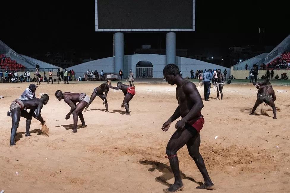 On the same evening, wrestlers compete in simultaneous bouts at a national arena in Senegal’s capital, Dakar.