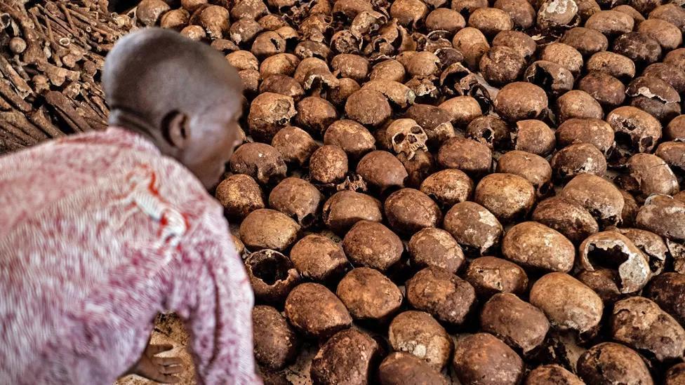 Since March, they have found more than 1,110 bodies of those killed in the 1994 genocide – here the village leader arranges some of the skulls.