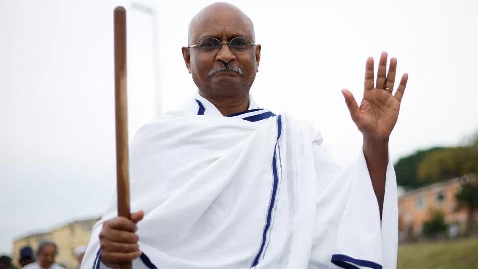 A Mahatma Gandhi lookalike takes part on Sunday in the Salt March in Durban, the South African city where the Indian independence hero once worked. It is held annually to mark a trek Gandhi made in 1930 in protest at British colonisers taxing salt.