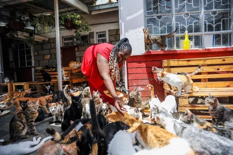 Rachael Kabue feeds some of the 500 cats who share her home in Nairobi, Kenya. She fosters them, giving them the treatment and vaccines they need before finding them new homes.