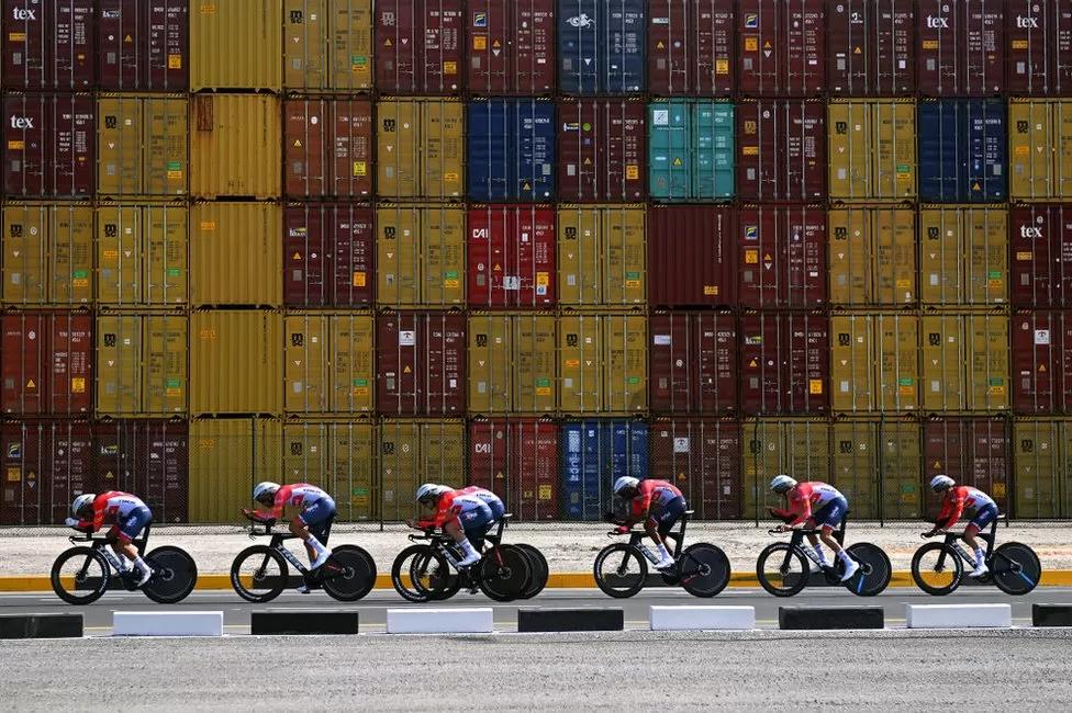 Amanuel Gehbreigzabhier of Eritrea battles other cyclists during stage two of the UAE Tour on Tuesday.
