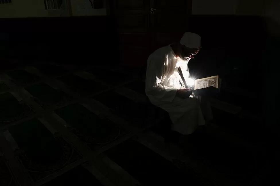 The frequent power cuts in South Africa are not putting off this man who is reading the Quran in a mosque in Cape Town on Wednesday – using the light from his mobile phone.