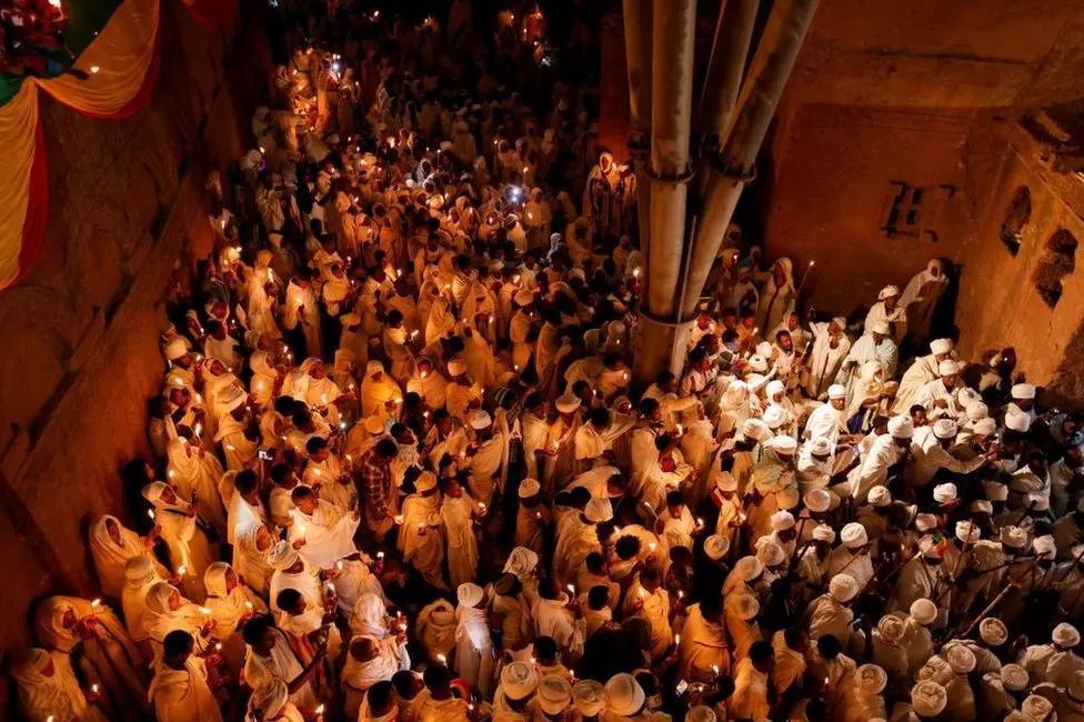Priests pack into one of the rock-hewn churches in the northern Ethiopian town of Lalibela for the Orthodox Christmas service on Saturday…