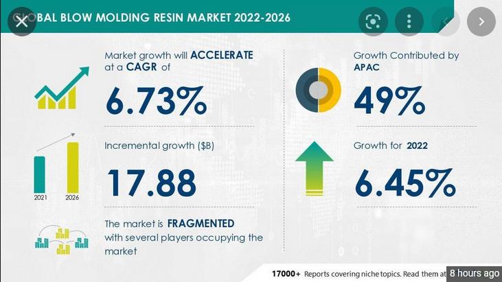 Africa-Press – Gambia. NEW YORK, March 18, 2022 /PRNewswire/ — “Blow Molding Resin Market by End-user and Geography – Forecast and Analysis 2022-2026” report has been added to Technavio’s offering. The market is expected to grow by USD 17.88 billion between 2021 and 2026. The market is anticipated to observe a YOY growth of 6.45% and accelerate at a CAGR of 6.73% during the forecast period.Market Dynamics