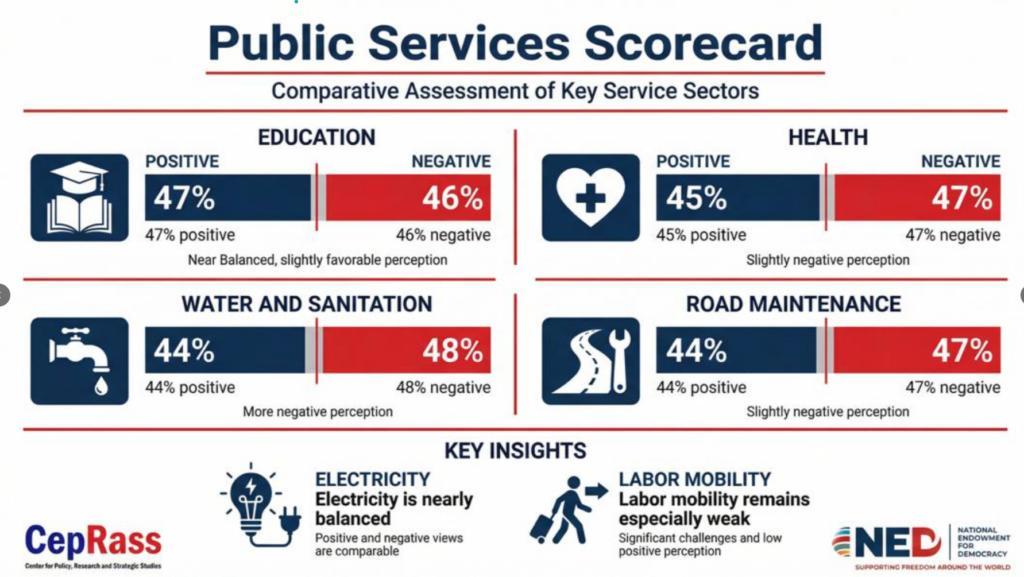The findings show that while overall ratings of public services are mixed, they tend to lean unfavorably. Labor mobility, for instance, is viewed as ineffective by about 45 percent of respondents, compared with 32 percent who consider it effective. Water and sanitation services received negative ratings from roughly 48 percent of those surveyed, while road maintenance and health services were each rated negatively by about 48 percent and 47 percent, respectively.