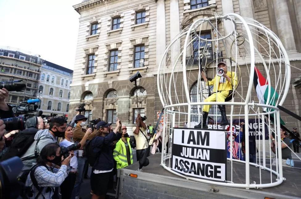 In 2020, she staged another protest in his support inside a giant bird cage.