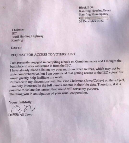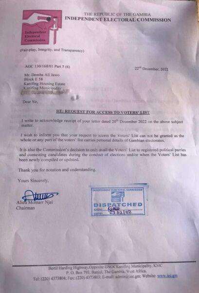 I went ahead to write a letter (below) to the Chairman, and to my surprise and disappointment, I received the following reply denying me access to the list on the pretext that “the whole or part of the voters’ list carries personal details of Gambian electorates.”
