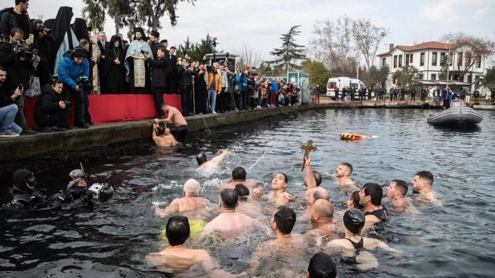 Greek Orthodox Christians now celebrate Christmas on 25 December but Friday was still a special day – the Feast of the Epiphany. These believers held up a wooden cross after retrieving it from the waters of the Golden Horn in Istanbul, Turkey.