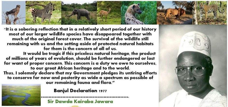The conservation message in the Banjul Declaration warned of the dangers of the loss of our priceless biodiversity if conservation efforts were neglected. To highlight this, Sir Dawda said, “It would be tragic if our priceless natural heritage, the product of millions of years of evolution should be endangered or lost for want of proper concern”. And that such a concern was a duty that the nation owed to itself, to our great African heritage and to the world.