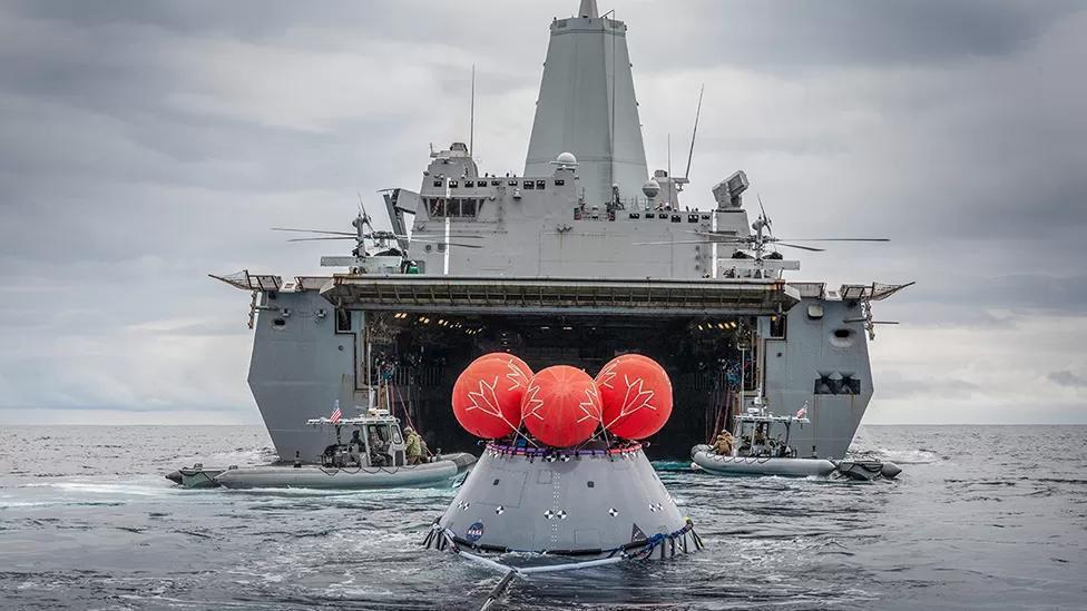 Nasa’s Melissa Jones, who’s in charge of the procedure, said various tests and assessments would be conducted while Orion was still in the water.