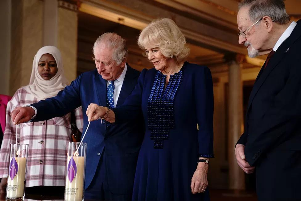 (Above and below) King Charles III and the Queen Consort lit candles at Buckingham Palace, London, alongside Holocaust survivor Dr Martin Stern and a survivor of the Darfur genocide, Amouna Adam.