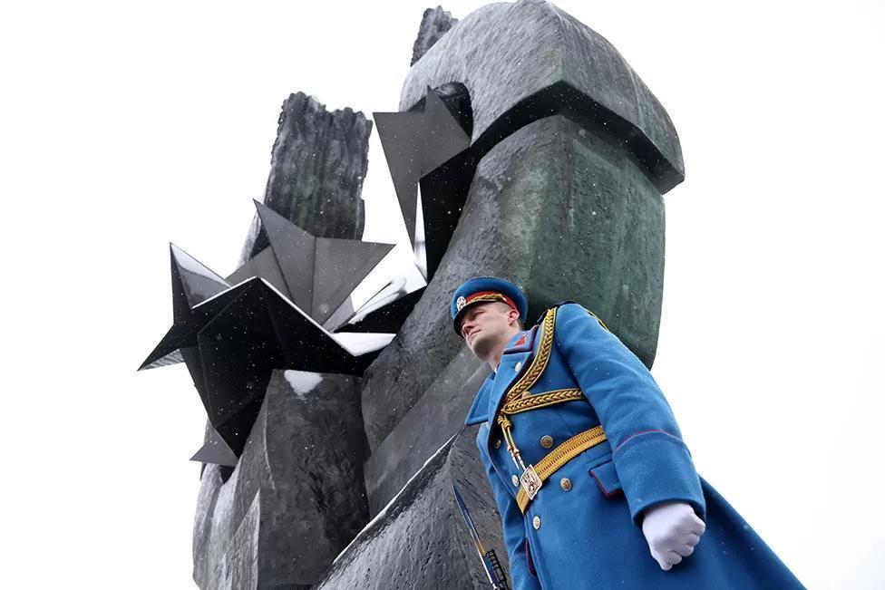 A member of the guard of honour of the Serbian Army stood at attention during a memorial service at the monument of victims of the Nazi concentration camp Sajmiste, in Belgrade, Serbia.