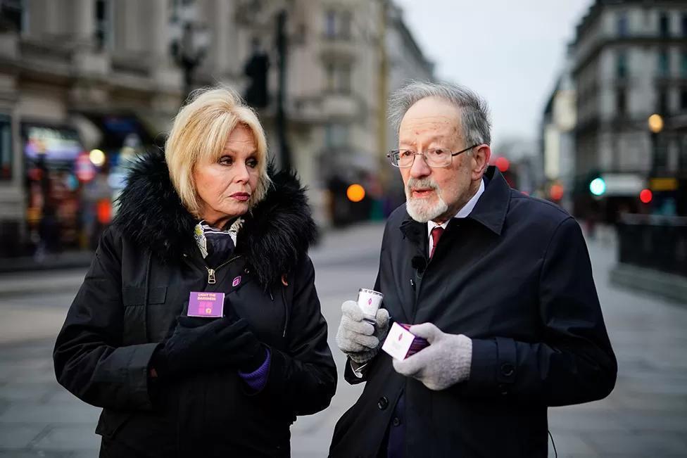 The British actress was handing out memorial candles, alongside Holocaust survivor Joan Salter (below, left) and Rwandan genocide survivor Antoinette Mutabazi (below, right).