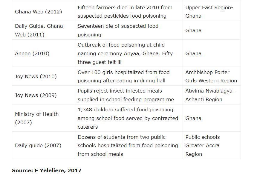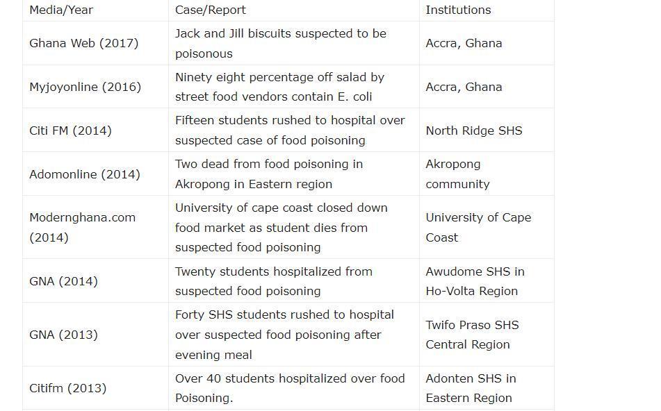 Below is a table of some reported incidents of suspected food poisoning in Ghana media.
