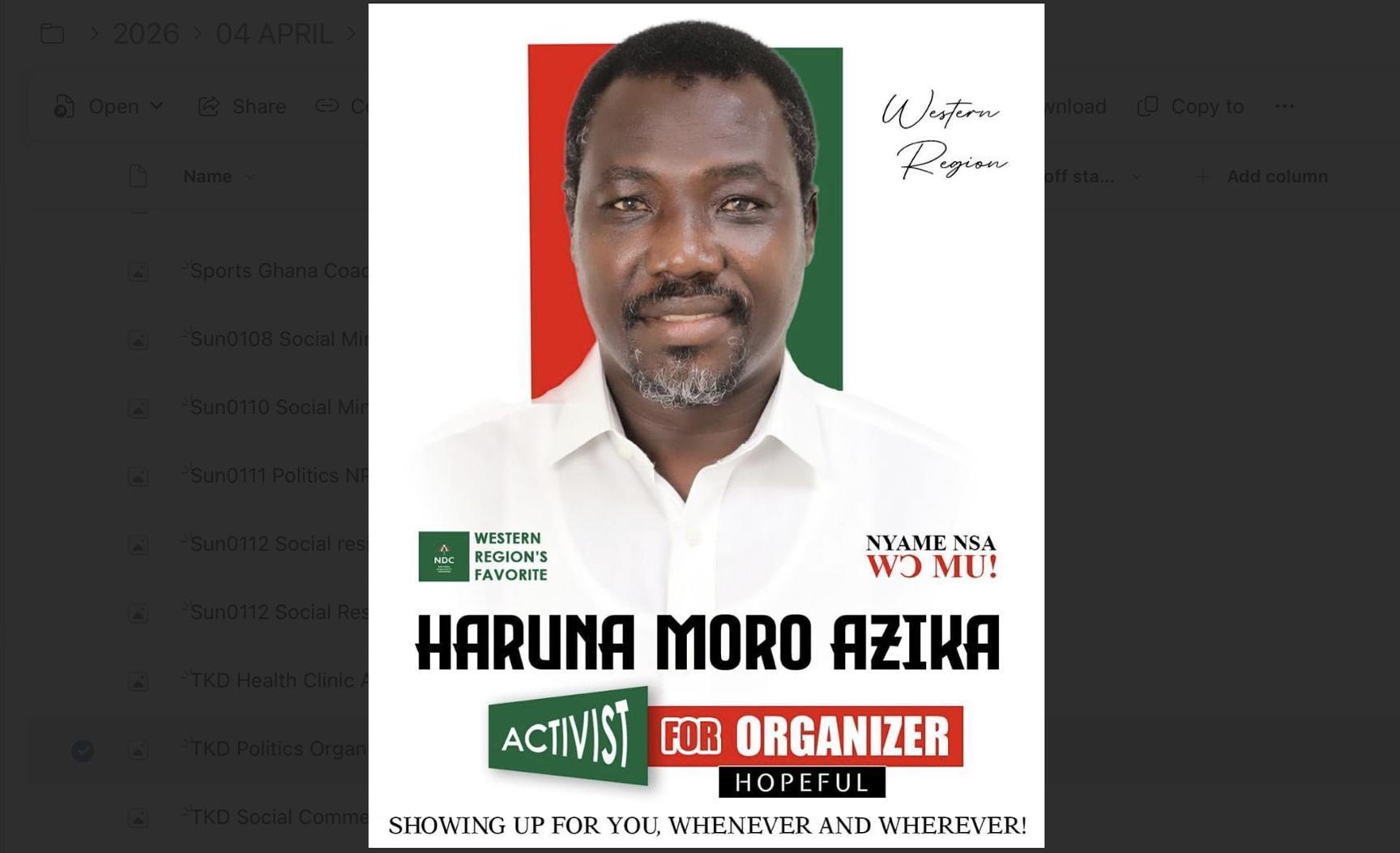 Africa-Press – Ghana. Mr Haruna Moro Azika , the National Democratic Congress (NDC) Constituency Chairman for Shama has declared his intention to contest the Western Regional Organizer position in the party’s upcoming internal elections.