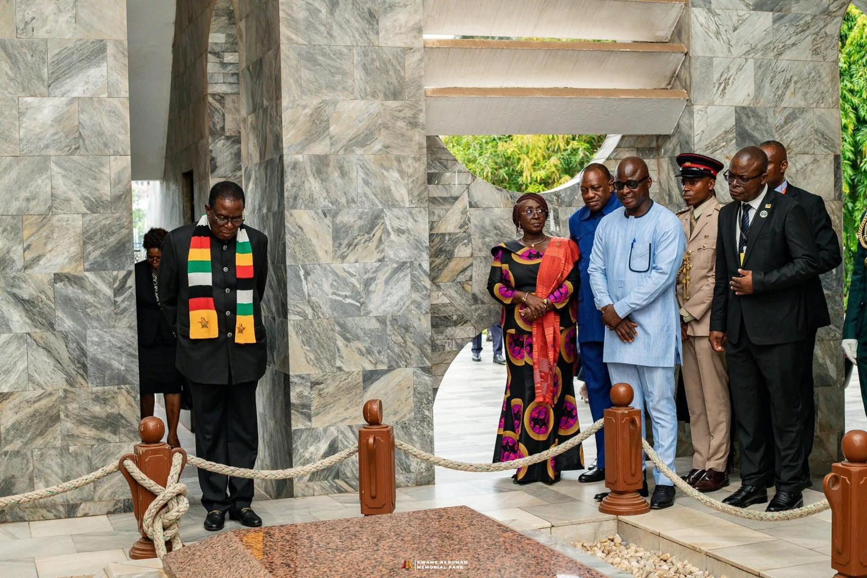 Africa-Press – Ghana. President Dr Emmerson Mnangagwa of Zimbabwe has paid tribute to Ghana’s Founding President Osagyefo Dr Kwame Nkrumah at the Kwame Nkrumah Memorial Park, in Accra.