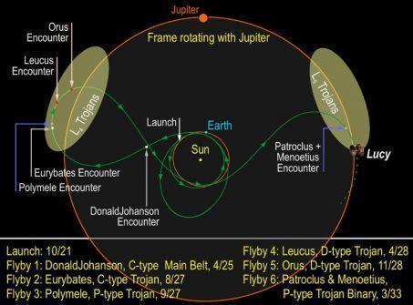 Il restera encore un autre survol d’entrainement, en 2025 au-dessus de l’astéroïde (52246) Donaldjohanson, pour s’assurer du bon fonctionnement de tous les instruments. La sonde se dirigera ensuite vers le groupe d’astéroïdes troyens de Jupiter situés au point de Lagrange L4 qu’elle explorera en 2027-2028 avec le survol de (3548) Eurybates et son satellite, (15094) Polymele, (11351) Leucus et (21900) Orus. Enfin, en 2033, elle visitera le groupe d’astéroïdes situés au point de Lagrange L5 et survolera (617) Patroclus-Menoetius, un astéroïde binaire.