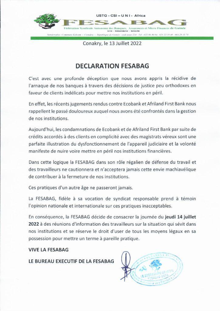 Africa-Press – Guinée. La condamnation par la Justice guinéenne des banques Ecobank et Afriland Fisrt Bank ne passe à la Fesabag (Fédération syndicale autonome des banques, assurances et microfinances de Guinée) qui rouspète et menace de se faire entendre. Ce jeudi, elle appelle à des réunions d’informations des travailleurs pour statuer sur le dossier…