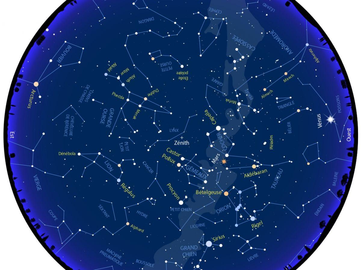 Faites tourner votre smartphone ou tablette de manière à ce que le nom de la direction dans laquelle vous observez soit écrit à l’endroit. Les constellations et les étoiles que vous retrouverez dans le ciel qui vous fait face sont toutes celles dont le nom est lisible sans trop pencher la tête. La position des planètes visibles à l’œil nu est indiquée pour le 15 du mois. Notre carte tracée pour une latitude de 47° nord montre le ciel visible en France métropolitaine, et plus largement en Europe et dans le monde, à l’intérieur d’une bande s’étendant de 40 à 54° de latitude nord. Si vous êtes au nord du 47e parallèle, l’étoile Polaire sera plus haute dans votre ciel et plus basse dans le cas contraire.