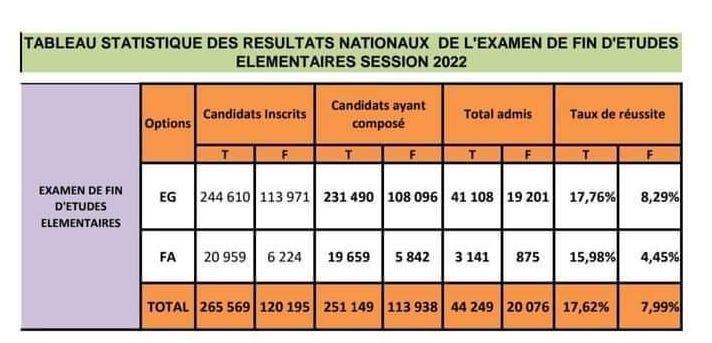 Africa-Press – Guinée. Le ministère de l’enseignement pré-universitaire et de l’alphabétisation (MEPU-A) a rendu public hier, lundi 27 juin 2022, les statistiques sur les résultats nationaux du certificat de fin d’études élémentaires (communément appelé examen d’entrée en 7ème année) session 2022 en Guinée.