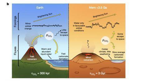 Mars et la Terre étaient au départ assez similaires: planète rocheuse, riche en carbone et en eau, à bonne distance du Soleil. “Mais Mars ne possède pas de tectonique de plaques, donc les émissions de gaz du volcanisme se sont épuisées au fil du temps, contrairement à la Terre”, pointe William Rapin, qui n’a pas participé à l’étude publiée en juillet. Car les volcans dégagent du CO2, celui-ci est capturé dans les roches, avant de finir par être ré-expulsé par de nouvelles éruptions volcaniques. Sur Mars, il n’y a pas ce recyclage du CO2 d’où son épuisement au fur et à mesure. Dès que l’eau liquide était en quantité suffisante, elle se transformait en carbonate avec le CO2: “il s’épuisait dès que les bonnes conditions étaient réunies », explique William Rapin.