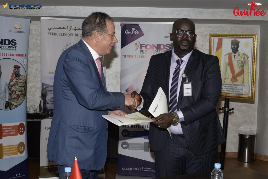 « Nous sommes très ravi cet après-midi de signer la convention de partenariat entre le Fonds de Développement Social et de l’Indigence (FDSI) et la Neuroclinique de Casablanca.D’abord, il est important de préciser que cette signature de partenariat vient à point nommé impulser un nouvel élan à la prise en charge sanitaire gratuite initiée par le gouvernement guinéen, sous le leadership de Son Excellence ,Président de la Transition, Chef de l’Etat, chef Suprême des armées, Colonel Mamadi Doumbouya.Aussi ,il faut préciser que c’est une réparation sociale car désormais il hors de question que des guinéens soient abandonnés parce qu’ils n’ont pas les moyens de se soigner. Cela relève de la volonté personnelle du Président de la Transition . », a expliqué M. Lansana Diawara avant de rajouter d’autres précisions : « Il faut surtout préciser que la Neuroclinique de Casablanca a une grande réputation sur le plan mondial. Tout récemment, un jeune guinéen a fait un accident à N’Zérékoré ,il a été évacué au niveau de la Neuroclinique ,malgré la gravité de son cas ,il s’en est sorti avec les sourires aux lèvres .Donc, tout cela a motivé la Direction Générale du Fonds de Développement Social et de l’Indigence FDSI à signer cette convention de partenariat. Nous avons perdu des malades parce que nous manquions de spécialistes pour leurs pathologies .Désormais, aucun guinéen ne sera abandonné par manque de solution locale. Même s’il faut aller cau dernier pays du monde pour trouver de l’espoir, nous le ferons..Je profite de ce micro pour remercier le Président de la Transition, le gouvernement guinéen ainsi que le Ministre de la Promotion Féminine de l’Enfance et des Personnes Vulnérables », a précisé le DG du FDSI.