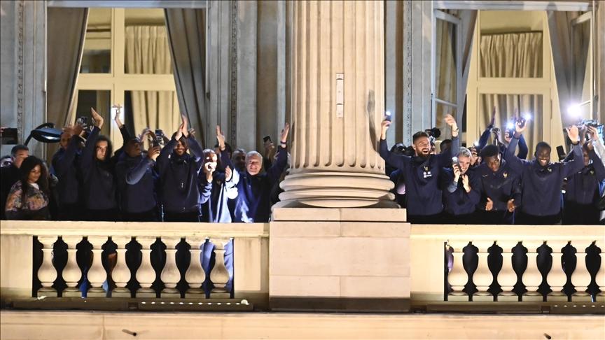 They waved their hands to salute fans before the rest of the squad, including superstar Kylian Mbappe, appeared on a balcony at the Hotel de Crillon near the square.