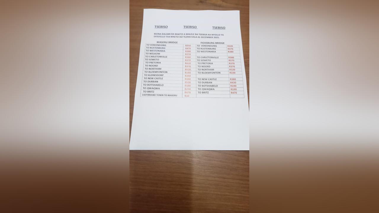 Maliboho Transport Forum Public Relations Mr. Thabiso Pitso said this in an interview with the Agency where he said the new prices will cover all the ports of entry between the two countries saying that for Maseru bridge and Ficksburg bridge from December 01 commuters will have to pay R/M 470 to Rustenburg, Noord it will be R370 while Bloemfontein from Maseru it will be R180 and Ficksburg will be R220.